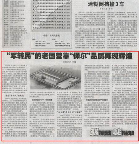 大連日?qǐng)?bào)在2011年8月16日A4版中,以“‘軍轉(zhuǎn)民’的老國(guó)營(yíng)靠‘保爾’品質(zhì)再現(xiàn)輝煌”為標(biāo)題對(duì)大連寶原核設(shè)備有限公司進(jìn)行了報(bào)道。原文轉(zhuǎn)載如下:
