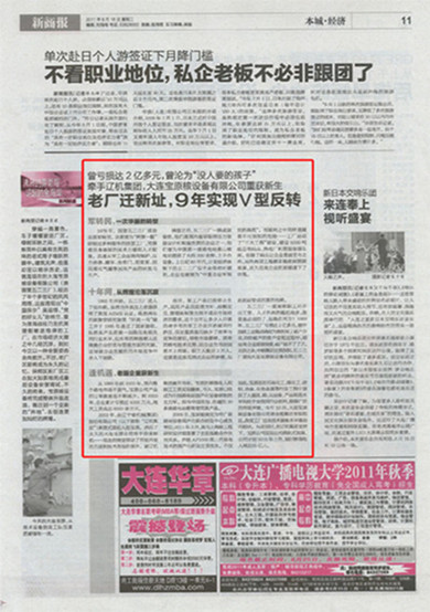新商報(bào)在2011年8月16日11版中,以“老廠遷新址,9年實(shí)現(xiàn)V型反轉(zhuǎn)”為標(biāo)題對大連寶原核設(shè)備有限公司進(jìn)行了報(bào)道。原文轉(zhuǎn)載如下: