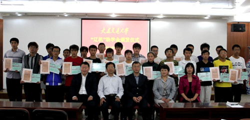 “遼機(jī)助學(xué)金”頒發(fā)儀式伊始,首先播放了集團(tuán)公司“鳳凰涅槃,光明更生”的企業(yè)宣傳片,集團(tuán)副總裁杜堅(jiān)毅先生宣讀了第二屆“遼機(jī)助學(xué)金”25名獲得者名單。集團(tuán)董事長(zhǎng)吳巖、副總裁杜堅(jiān)毅、董事會(huì)秘書(shū)馬桂環(huán)與校方領(lǐng)導(dǎo)一同為受資助的大一新生頒發(fā)助學(xué)金。吳巖董事長(zhǎng)和大連交通大學(xué)黨委副書(shū)記劉璽明別代表校企雙方發(fā)表了講話(huà),對(duì)獲得資助同學(xué)表示祝賀,并期望獲獎(jiǎng)同學(xué)努力學(xué)習(xí),用自己的才智來(lái)回饋社會(huì),為社會(huì)發(fā)展做出貢獻(xiàn)。