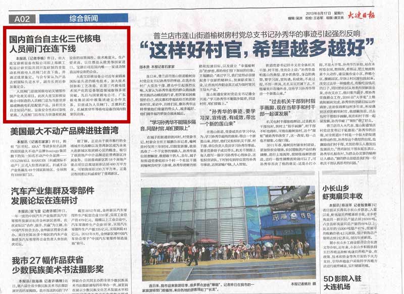 《大連日?qǐng)?bào)》在2013年8月17日 A02版,以“國(guó)內(nèi)首臺(tái)自主化三代核電人員閘門(mén)在連下線(xiàn)”為標(biāo)題對(duì)大連寶原核設(shè)備有限公司“自主化非能動(dòng)系列核電廠(chǎng)人員閘門(mén)樣機(jī)”成果鑒定會(huì)進(jìn)行了報(bào)道。原文轉(zhuǎn)載如下: