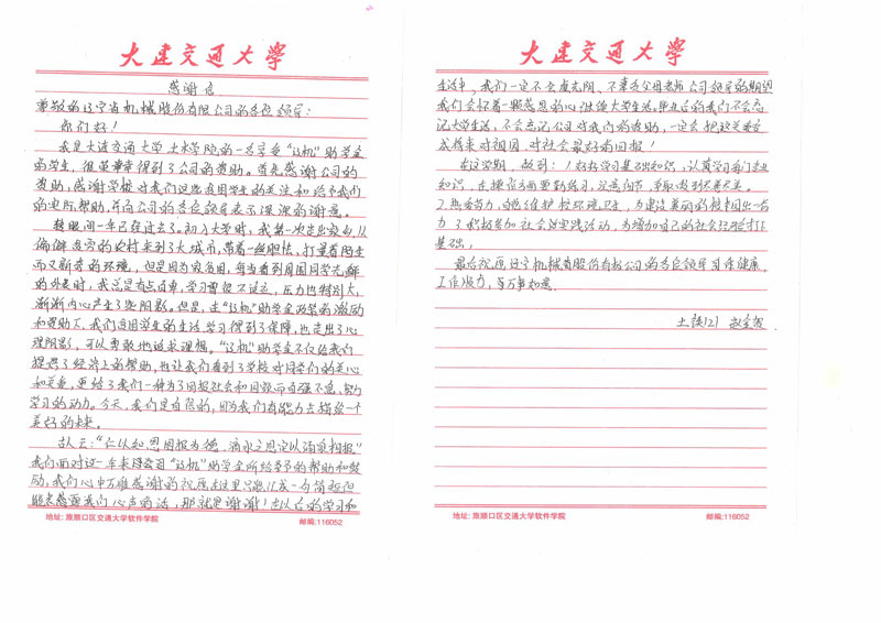 近日,公司收到一封來(lái)自大連交通大學(xué)的感謝信。寄信人是交通大學(xué)土木學(xué)院一名大二學(xué)生,系2012年遼機(jī)助學(xué)金的獲得者。在信中,他表示:感謝公司的資助,并向公司的各位領(lǐng)導(dǎo)表示深深的謝意。在遼機(jī)助學(xué)金政策的激勵(lì)和資助下,我們貧困學(xué)生的生活學(xué)習(xí)得到了保障,也走出了心里的陰影,可以勇敢的追求理想,更給了我們一種為了回報(bào)社會(huì)以及國(guó)家自強(qiáng)不息、努力學(xué)習(xí)的動(dòng)力。