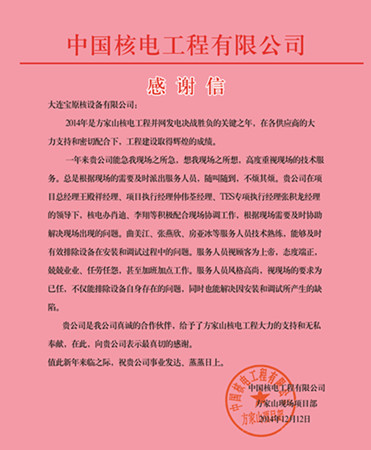 2014年是中國(guó)核電工程有限公司方家山核電工程并網(wǎng)發(fā)電決戰(zhàn)勝負(fù)的關(guān)鍵之年,寶原公司項(xiàng)目人員一直以來(lái)高度重視項(xiàng)目現(xiàn)場(chǎng)的技術(shù)服務(wù),不厭其煩,隨叫隨到,提供了周到的服務(wù)。為此,方家山現(xiàn)場(chǎng)項(xiàng)目部對(duì)寶原公司項(xiàng)目組人員給予的服務(wù)和支持表示真切的感謝,并發(fā)來(lái)《感謝信》。