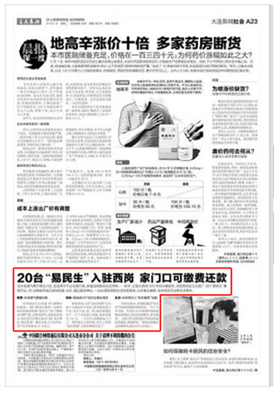《半島晨報(bào)》在2015年6月16日A23版,以“20臺(tái)‘易民生’入駐西崗,家門(mén)口可繳費(fèi)還款”為標(biāo)題對(duì)大連迅通網(wǎng)絡(luò)技術(shù)有限公司“易民生”智能終端進(jìn)行了報(bào)道。原文轉(zhuǎn)載如下: